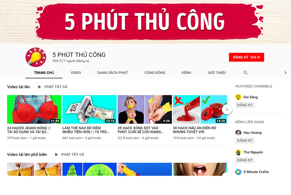 Đây là kênh Youtube chính thức của 5-minute Crafts tại Việt Nam. Với lời giới thiệu "Vui vẻ tự làm dự án, hàng thủ công, trải nghiệm niềm vui khi tự làm nó!", chắc chắn bạn có thể tìm thấy những video cực kì thú vị về DIY, handmade và kể cả các tips, mẹo vặt ở đây!